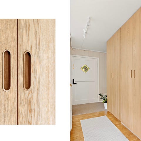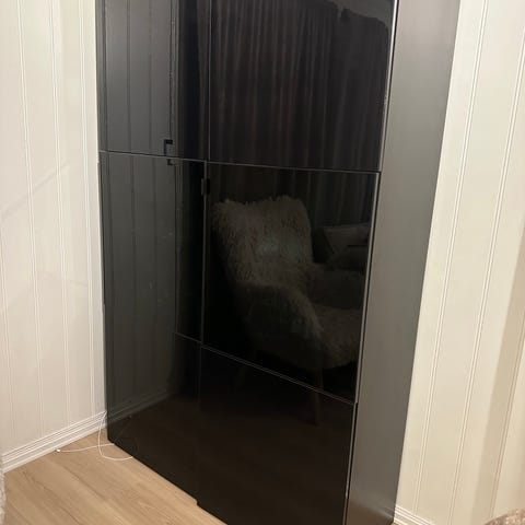 Pax garderobeskap fra IKEA, kjøpt nytt i 2020. Skapstamme i mørk eik (folie), og dører i brunsvart farge, antagelig den utgåtte modellen Tanem. Den ene siden av skapet har garderobestang og tre skuffer+ 1 trådkurv, den andre siden har 11 trådkurver. Skapet er i god stand, kun en av de tre skuffene har noen bruksmerker (se bilde). Det er ikke montert håndtak på skapdørene, så her står man fritt til å velge håndtak selv.