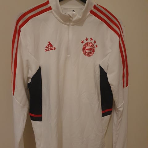 Adidas Bayern München fotballtrøye for menn i størrelse M. Langermet modell i rød farge med klubbemblem og sponsorlogo på brystet, samt «Bayern München» trykk på ryggen. Egnet til fotballspill eller som supportereffekt på kamp og trening.