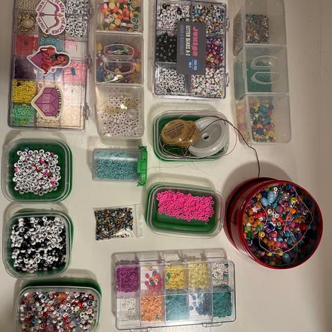Sytilbehør pakke med assorterte knapper og sytråd. Inneholder mange små ruller sytråd i ulike farger, samt et stort utvalg knapper i forskjellige størrelser, fasonger og farger. Noen knapper ligger i små plastposer, andre i bokser og glass. Pakken inkluderer også noen dekorative knapper og trykknapper på kort. Egner seg til søm, reparasjon av klær, hobbyprosjekter og annet håndarbeid.
