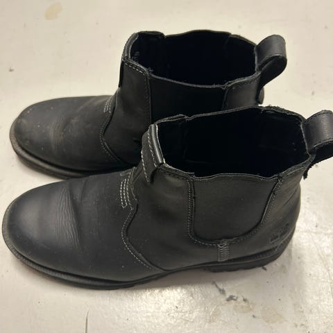De har ikke blitt mye brukt, men har litt bruksmerker som kan ses på bildene. Ingen skader i helkopp og sålene har mye bruk igjen. En av skinnlappene på tungen på en sko er falt av.