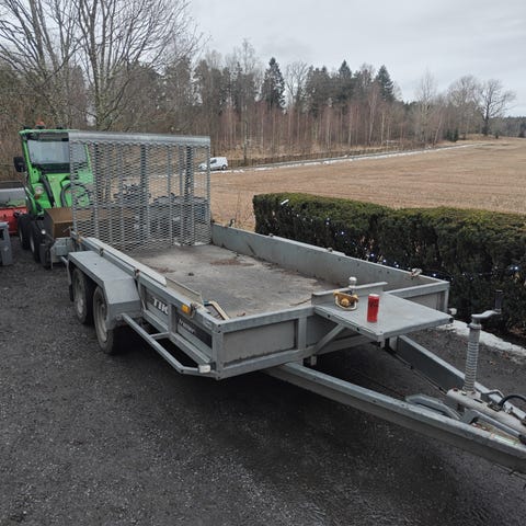 Biltransporthenger med to aksler og åpent plan. Hengeren har kraftig, galvanisert stålramme og kjørebroer bak for enkel lasting og lossing av kjøretøy eller maskiner. Foran er det montert en manuell vinsj med vaier for trekking av last opp på planet. Hengeren er utstyrt med vinterdekk på stålfelger og helårsdekk stålfelger