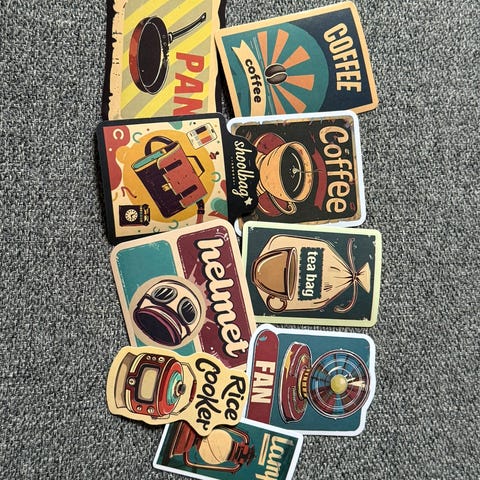 Blandet parti klistremerker i ulike størrelser, fasonger og motiver. Inneholder blant annet figurmagneter, rektangulære magneter, klistremerker med ulike illustrasjoner og noen suvenirmagneter. Egnet for bruk på kjøleskap, tavler eller andre magnetiske flater, samt til dekorasjon av notatbøker, mapper og lignende overflater der klistremerker fester. Selges samlet som én pakke.