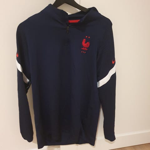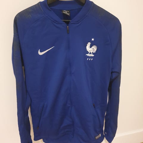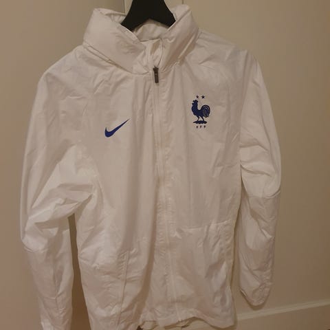 Nike Frankrike fotballjakke for herre i størrelse M. Jakken er hvit med glidelås i front og sidelommer med glidelås. Den har Frankrikes landslagslogo på brystet og Nike-logo på motsatt side. Egnet som treningsjakke eller fritidsjakke i forbindelse med fotball og annen lett aktivitet.