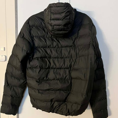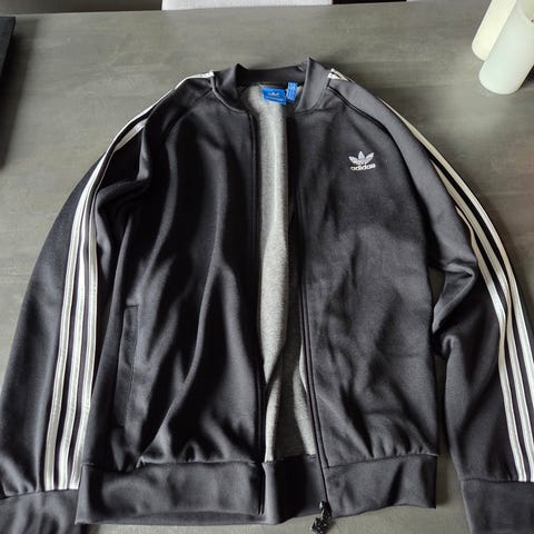 Adidas jakke for herre i størrelse M. Jakken er svart med hvite striper på skuldrene og har glidelås foran. Passer til hverdagsbruk og trening.