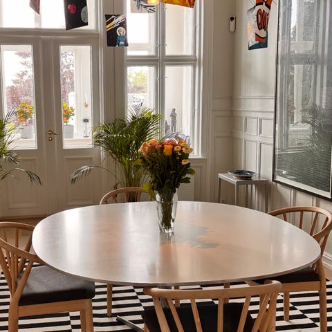 Få rommet til å se større ut. Fordi dette spisebordet har rund form, er det perfekt for mindre rom. Det er også lett å skape koselig stemning når alle sitter nær hverandre. Takket være utseendet som ligner naturlig eik, passer dette bordet fint til både mørke og lyse farger. Bordplate av lakkert MDF.