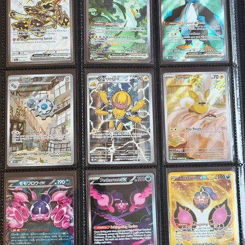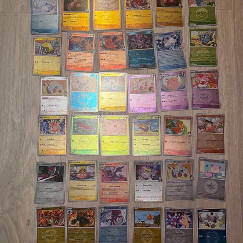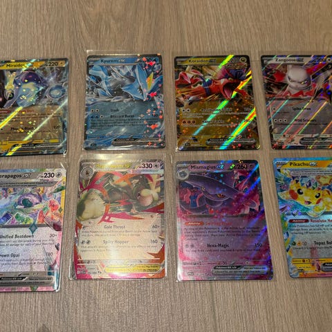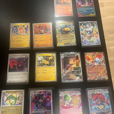 Sterk miks av EX, Full Art og populære karakterer som Charizard, Pikachu og Miraidon.