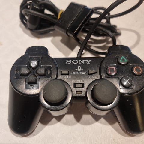 Sony DualShock 2 håndkontroller med kabel i grå farge. Standard PlayStation 2-kontroller med to analoge spaker, retningsknapper, fire frontknapper, start- og select-knapp samt L1, L2, R1 og R2 skulderknapper. Tilkobling via original PlayStation 2-kontakt (kablet). Egnet som ekstra eller erstatningskontroller til PlayStation 2-konsoll.