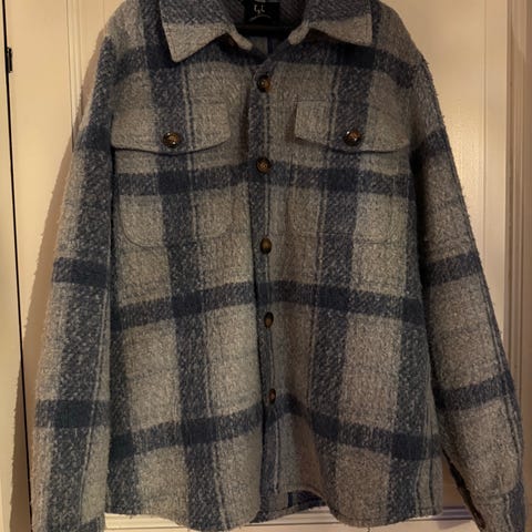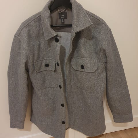 H&M jakke for herre i størrelse M. Jakken har et flerfarget mønster i hovedsak svart, grått og hvitt, med krage og knappelukking foran. Den har minst én brystlomme og sidelommer. Passer som ytterjakke eller overskjorte i overgangssesonger.