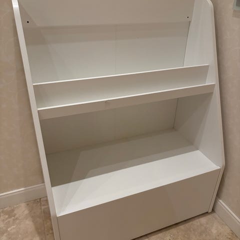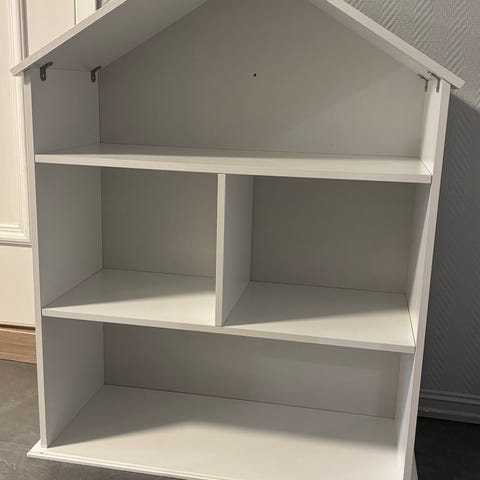 Bokhylle/barnereol i hvit utførelse med stjernemotiv på sidene og i toppen. Reolen har flere åpne hyller som egner seg til oppbevaring av bøker, leker eller annet barneromsutstyr. Passer til bruk på barnerom eller lekerom. Materiale er trebasert plate med malt overflate. En bitteliten skramme i høyre hjørne er alt jeg kan finne på den. (Se bilde) selges for 600kr. Kan hentes på Sveberg.