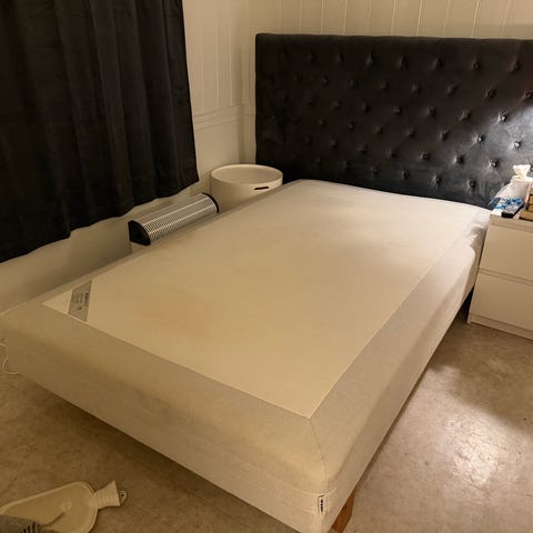 En veldig vakker seng som inkluderer en veggstøtte og et lite klesskap på siden av sengen. Fargen er grå.