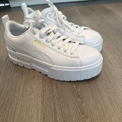 Puma sneakers i størrelse 37. Modellen er lave joggesko med snøring og kraftig såle. Passer til hverdagsbruk og fritid. Materiale hvit leather med gummisåle