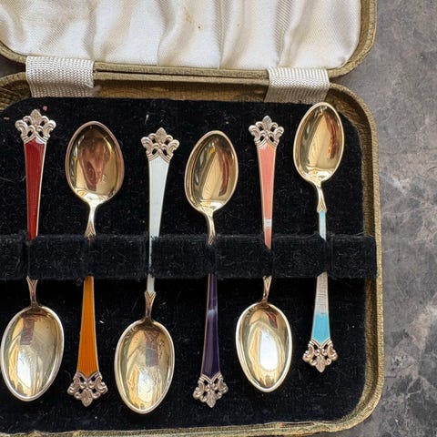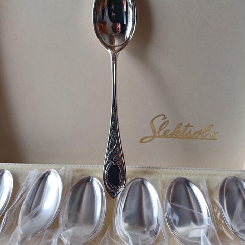 Sett med 12 stk sølvbelagte teskjeer av drage i original eske. Skjeene har dekorert skaft og ligger i en foret eske med rød innside. Passer som teskjeer til kaffe eller te, eller som serveringsskjeer til dessert. Antall skjeer og nøyaktig mønster fremgår av bildene. Disse teskjeer har aldri blitt brukt og fremstår som ny. Dagen stk pris på teskje er 1100-1200kr total verdi mellom 13200kr -14400kr. Ved rask handel selges disse for 8000kr