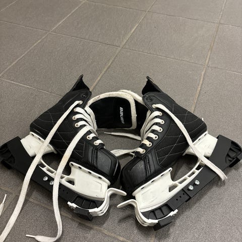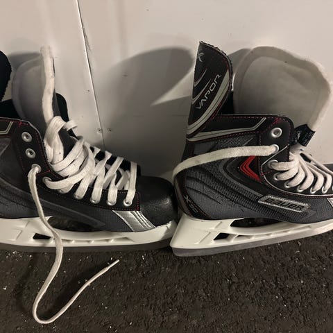 Bauer Vapor ishockeyskøyter i svart. Klassisk modell med snøring og polstret pløse for støtte rundt ankelen. Skøytene har hvite lisser og hvit skøytestålholder. Egnet til ishockeybruk på isbaner og ishaller. De er godt brukt og noen synlig skader på lissene. Kjøpt for 3000