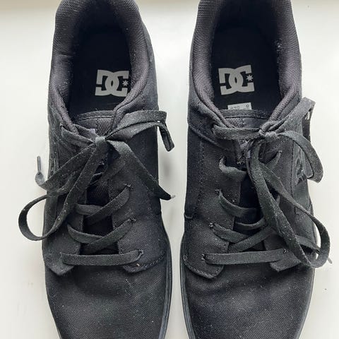 DC sneakers joggesko i størrelse 38,5 Skoene er i svart farge med snøring og flat såle. Modellen passer til hverdagsbruk og lett aktivitet. Overdelen er i tekstil og syntetisk materiale, med polstret hælparti og pløse for økt komfort. Yttersålen er i gummi med mønster for grep mot underlaget. Egnet for bruk til fritid og uformelle anledninger.