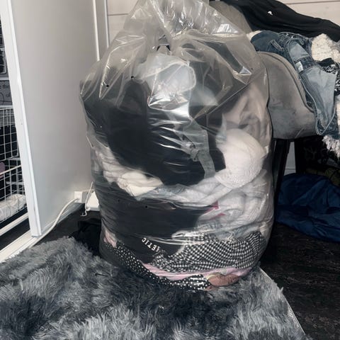 Selger to store sekker med klær. Inneholder alt fra kjoler, gensere, bukser, skjørt, shorts osv,