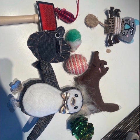 Sett med 4 ulike katteleker i forskjellige former og farger. Inkluderer baller og andre lekeelementer for katt.