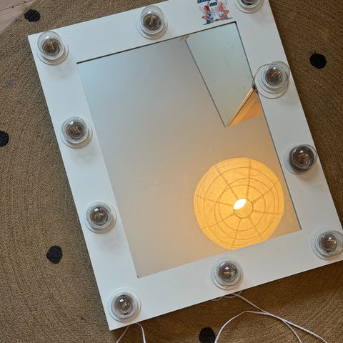 IKEA speil med lyspærer langs begge sider. Rektangulær modell som kan brukes som sminkespeil eller baderomsspeil. Kan monteres på vegg i soverom, gang eller bad etter behov, for eksempel over kommode eller servant. Jeg brukte dette som mitt sminkespeil
