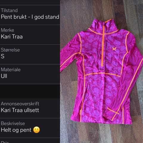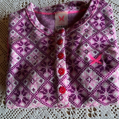 Ulltrøye for dame i størrelse M. Trøyen har rødt bunnstoff med mønster i kontrastfarger og lange ermer. Den har rund hals med kort knappestolpe foran. Passer som innerste lag til ulike utendørsaktiviteter eller til hverdagsbruk der man ønsker et varmt og behagelig plagg i ull.