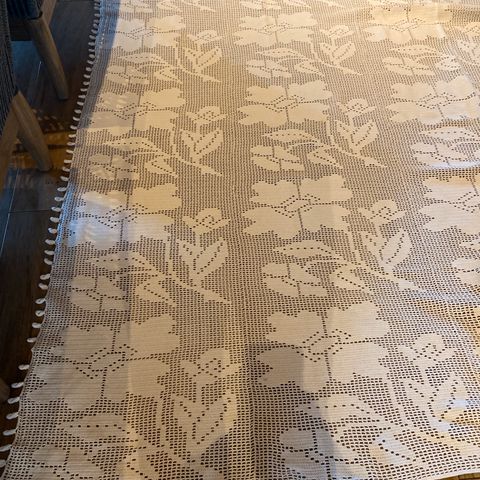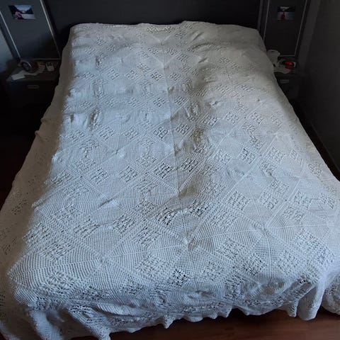 Nydelig gammelt heklet sengeteppe selges til fastpris. Nyvasket. Ingen skader eller flekker.
