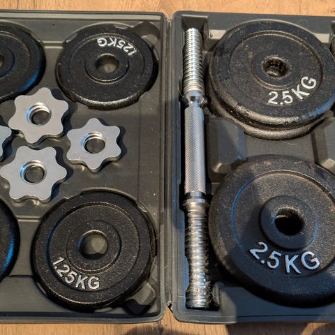 Dumbbell Set opp til 18 kg med vektskiver selger. Koffert følger med