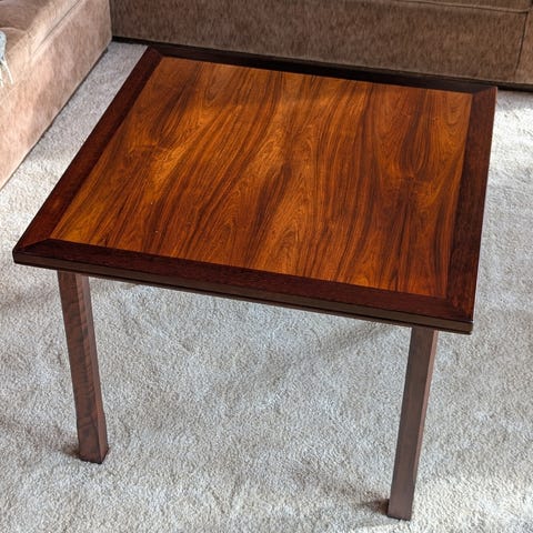Lite bord, brunt, kvadratisk, plate 73 cm, høyde 50 cm