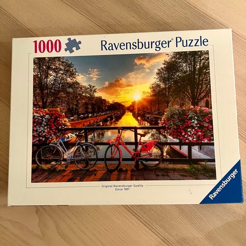 Ravensburger Amsterdam puslespill med 1000 brikker. Motiv av bymiljø fra Amsterdam med kanaler, bygårder og mennesker. Puslespillet passer for ungdom og voksne som liker detaljrike motiver og pusleprosjekter med middels til høy vanskelighetsgrad. Egnet til innramming etter fullføring dersom ønskelig.
