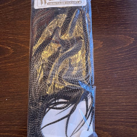 Halv sadel med lange fjær hovedsakelig beregnet for tørrfluebinding. Fargen er grizzly (sort/hvit stripet). Egnet til å binde en rekke tørrfluer i ulike størrelser, men denne er i hovedsak størrelse 8-12 og er resterende etter at en god del gjær allerede er brukt.