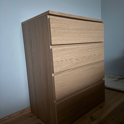 Malm kommode fra IKEA med 4 skuffer. Lite merke på toppen (se bilde), ellers ingen skader.