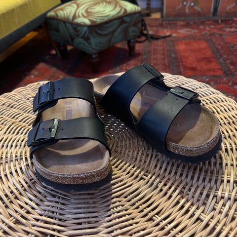 Scholl klassiske sandaler Airbase i svart nubuck med anatomisk oppbygd fotseng og ekstra demping. Sandalene har to justerbare remmer og Scholls ergonomiske fotseng Bioprint Adapta, som gir støtte både til svangen og forfoten. Pent brukte og i god stand.