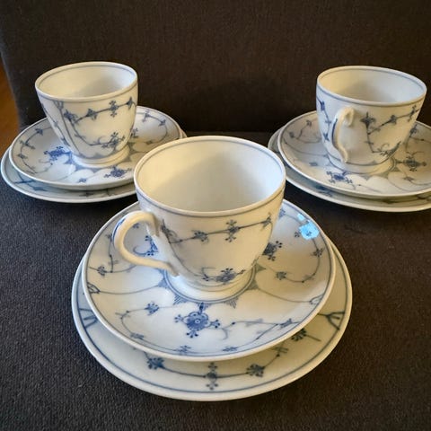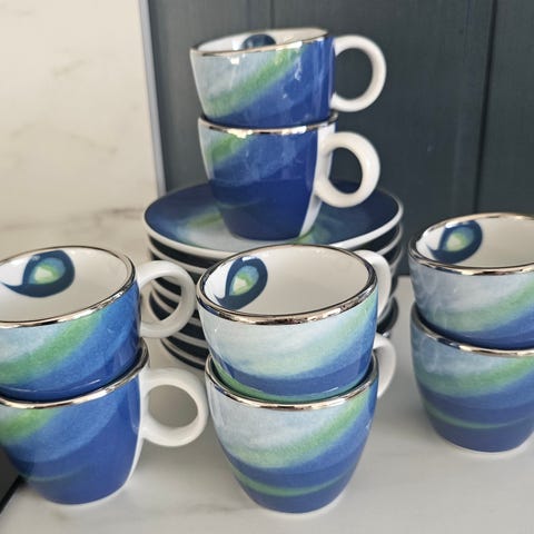 To espresso kopper fra Porsgrunn porselen fra år 2000. Mener de er designet av kunstneren Ole Lislerud. Brukt få ganger. Sølvfarget underskål. Pris kr 50/ enhet.Overlevering/ forsendelse avtales direkte.