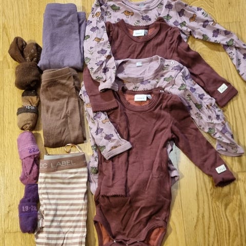 Babyklær for jente i størrelse 68 i ulike rosatoner. Pakken inneholder et utvalg plagg som ullbodyer, overdeler, bukser og strømpebukse. Fargene går i rosa, lys rosa, lilla og nøytrale toner, noen med enkle mønstre eller detaljer. Klærne passer til hverdagsbruk for babyjente i størrelse 68. Body fra Janus er i str 60. Åpen for pruting