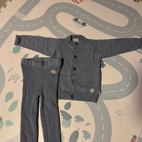 Lillelam ullsett for gutt i størrelse 92. Sett i blå ull som består av bukse og jakke/cardigan med knapper foran. Strikket struktur øverst på jakken og ribbestrikkede kanter. Egnet som hverdagsplagg eller mellomlag på kjølige dager. Nesten ikke brukt.