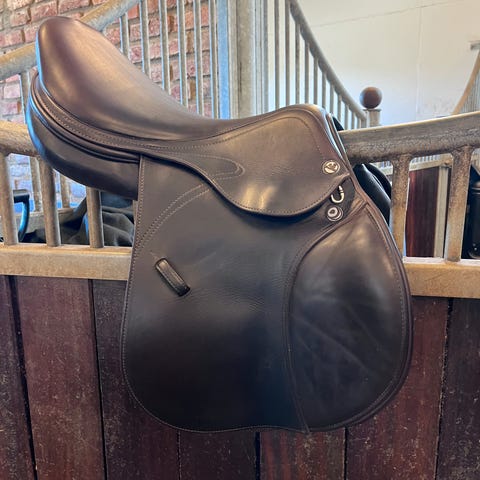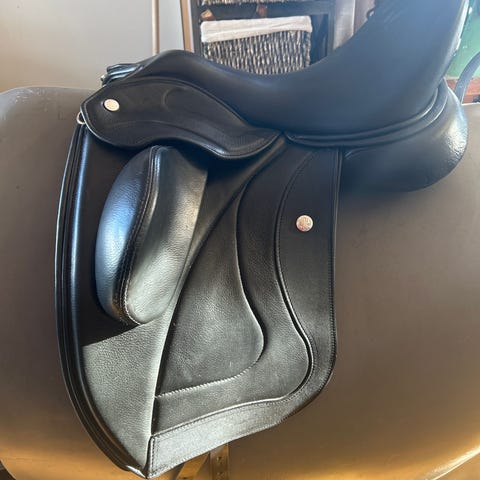 Ideal Podjuski Dressursal i svart lær. 17 sete . M/w bom.Salen har dype puter og knestøtter som gir en stabil sits ved dressurridning. Passer til bruk på ridehest i daglig trening eller konkurranse.Egner seg til rytter som ønsker en klassisk, svart dressursal i lær. Ikke brukt etter full omstopp.