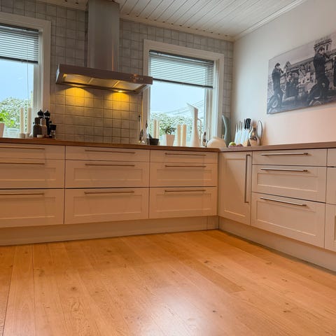 Kjøkkenet er fra IKEA. Enkelte bruksmerker, benkleplate bør pusses. Vask i hvit porselen har synlige bruksmerker. Men ellers lite man ser eller legger merke til.