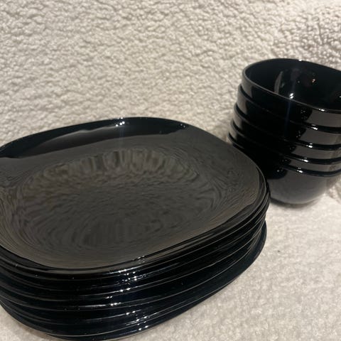IKEA servise med tallerkener og boller i grå farge. Består av flate tallerkener og dype boller i samme serie. Nøytral, mørk gråtone som passer i de fleste kjøkken. Egnet til daglig bruk til middag, frokost og servering av ulike retter. Materiale fremstår som keramikk/steingods basert på utseende i bildene.