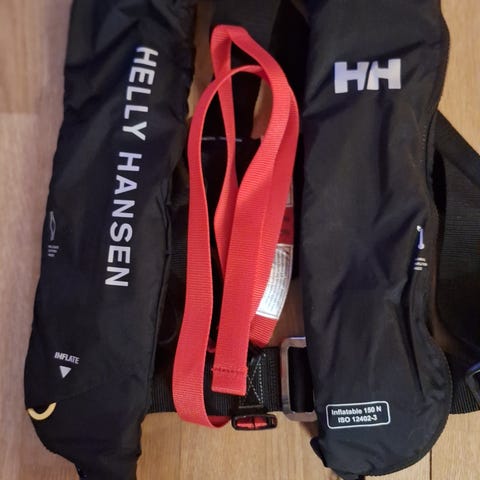 Selger en flott redningsvest fra Helly Hansen. Den er helt i orden, men den må kanskje på service for og sjekke tablett og gass