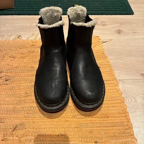 Dr. Martens vinterstøvler i størrelse 40. Støvlene er i svart skinn med snøring foran og karakteristisk Dr. Martens-hempe bak på skaftet. Innvendig fôret for ekstra varme. Yttersåle i gummi med godt mønster. Passer som robuste vinterstøvler til hverdagsbruk.