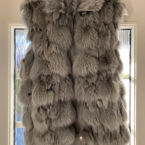 En helt nydelig vest i revepels selges da den aldri brukes. Farge på pelsen er lys grå/brun. Innerstoff mørk brun.