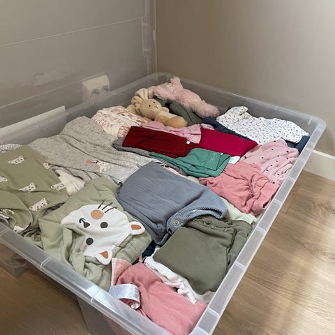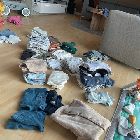 Det er i strl 62 stort sett (noe 62/68). Noe er en liten 62, noe stor 62. Og noe står det noe annet i, men som tilsvarer 62 😊