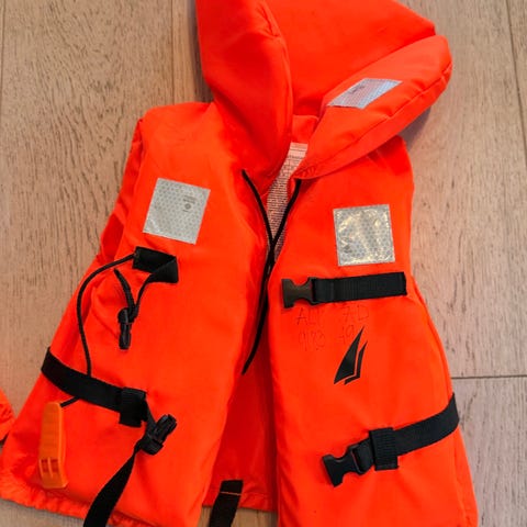 Med glidelås, justerbare midjebånd, greinbånd, fløyte og reflekser.