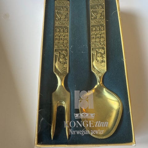 Viking Tinn, Kongetinn, salatbestikk, tinnbestikk, norsk tinn, Heilage Olav, Hellige Olav, stavkirke, vikingskip, norsk design, vintage, retro, samleobjekt, brukskunst, serveringsbestikk, tinnskje, tinngaffel, Norge Tinn.