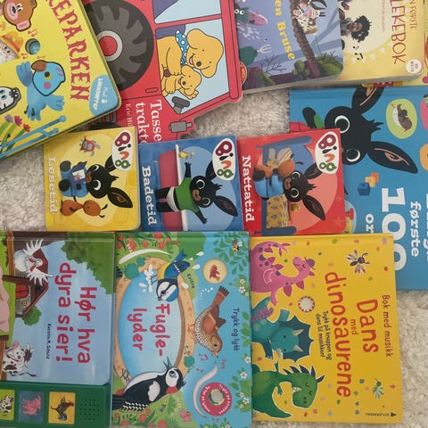 Samling med diverse barnebøker og bildebøker på norsk. Utvalget inkluderer blant annet sangbok, rim- og reglebok, julefortelling, klassiske eventyr og andre illustrerte bøker for barn. Bøkene har varierende temaer som dyr, natur, jul og kjente barnefigurer. Egner seg for høytlesning og egenlesing for barn i barnehage- og småskolealder.