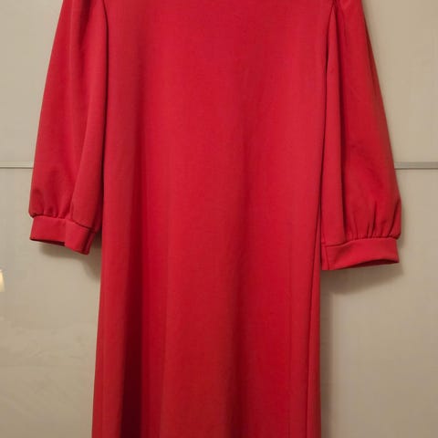 Kjolen er rosa og laget i polyester. Modellen har kort lengde med volangkant nederst og korte ermer.