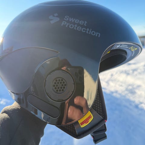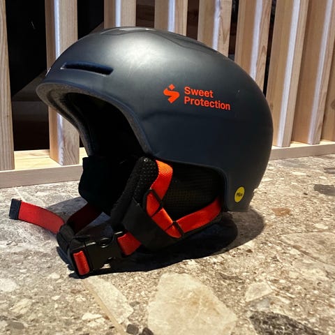Sweet Protection skihjelm. Hjelmen er i grå/svart farge med ventilasjonsåpninger på toppen og sidene. Justerbar stropp under haken og bakjustering for bedre passform. Egnet til alpint og snowboardbruk.