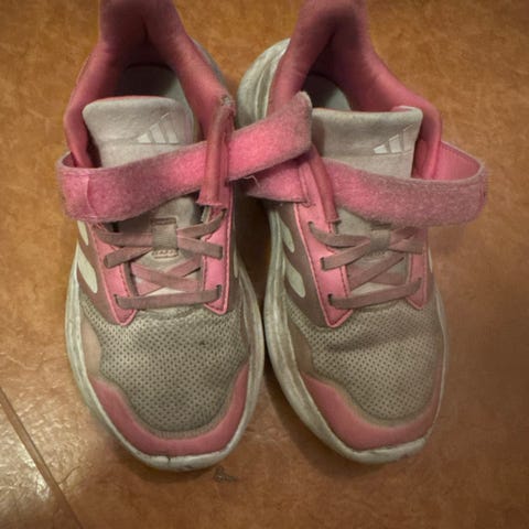 Adidas joggesko for jente i størrelse 32. Skoene er rosa med hvite detaljer og lisser. Det er borrelås øverst for enkel av- og påkledning. Overdelen er i tekstil med syntetiske partier, og sålen er i gummi med mønster for grep. Egnet som hverdagssko og til lett aktivitet for barn. Selges billig pga bruksmerker😇