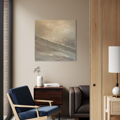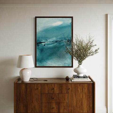 Veggbilde med abstrakt landskapsmotiv i brun- og beige toner. Bildet er innrammet og henger på vegg over en kommode. Fargene går i varme jordtoner som kan passe i stue, gang eller soverom. Egnet som veggdekor i moderne eller minimalistisk interiør.