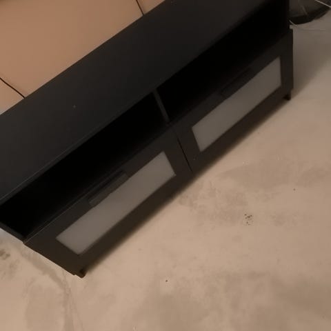 Passer langs vegg i stue eller TV-rom, og gir både avlastningsflate og lukket/halvåpen oppbevaring for utstyr og tilbehør.