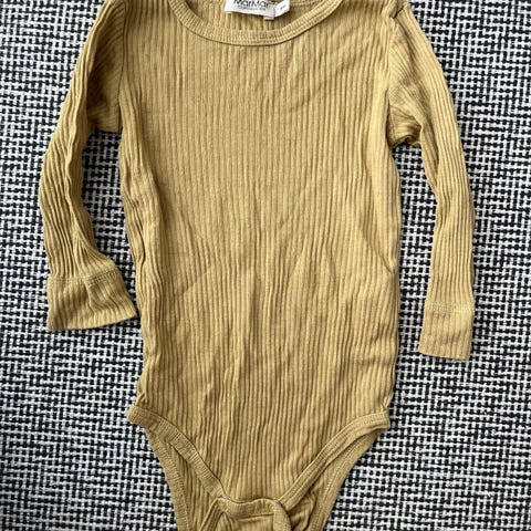 MarMar Copenhagen babyset i ribbestrikket body og bukse i fargen okergul. Materiale i deilig myk bomull.