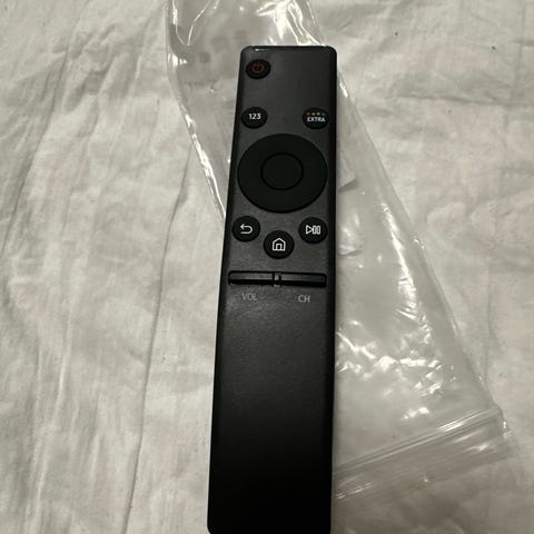 fjernkontroll i svart farge. Fjernkontrollen har egne knapper for blant annet Netflix, Samsung TV Plus, Disney+ og Prime Video, samt standard navigasjons- og volumknapper. Samsung TV-modeller