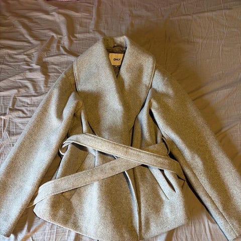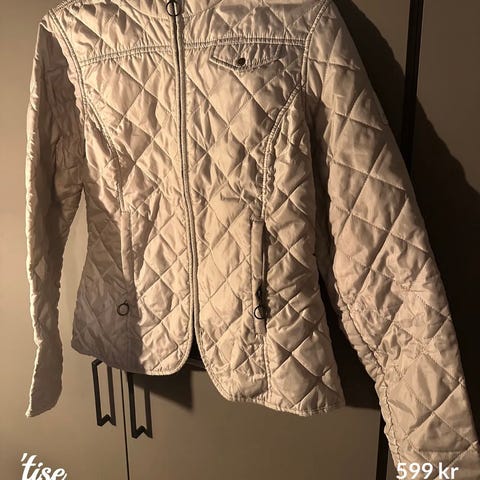 ONLY jakke for dame i størrelse M. Jakken er laget i polyester og har et beige mønster med kontrastkanter. Modellen har åpen front uten glidelås eller knapper og to påsydde lommer foran. Passer som lett ytterjakke eller som et lag over andre plagg.